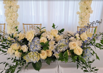 At the church, we used textural arrangements that felt welcoming and sacred—classic whites with natural greenery, styled to enhance the architecture and create a serene atmosphere for vows and family blessings.