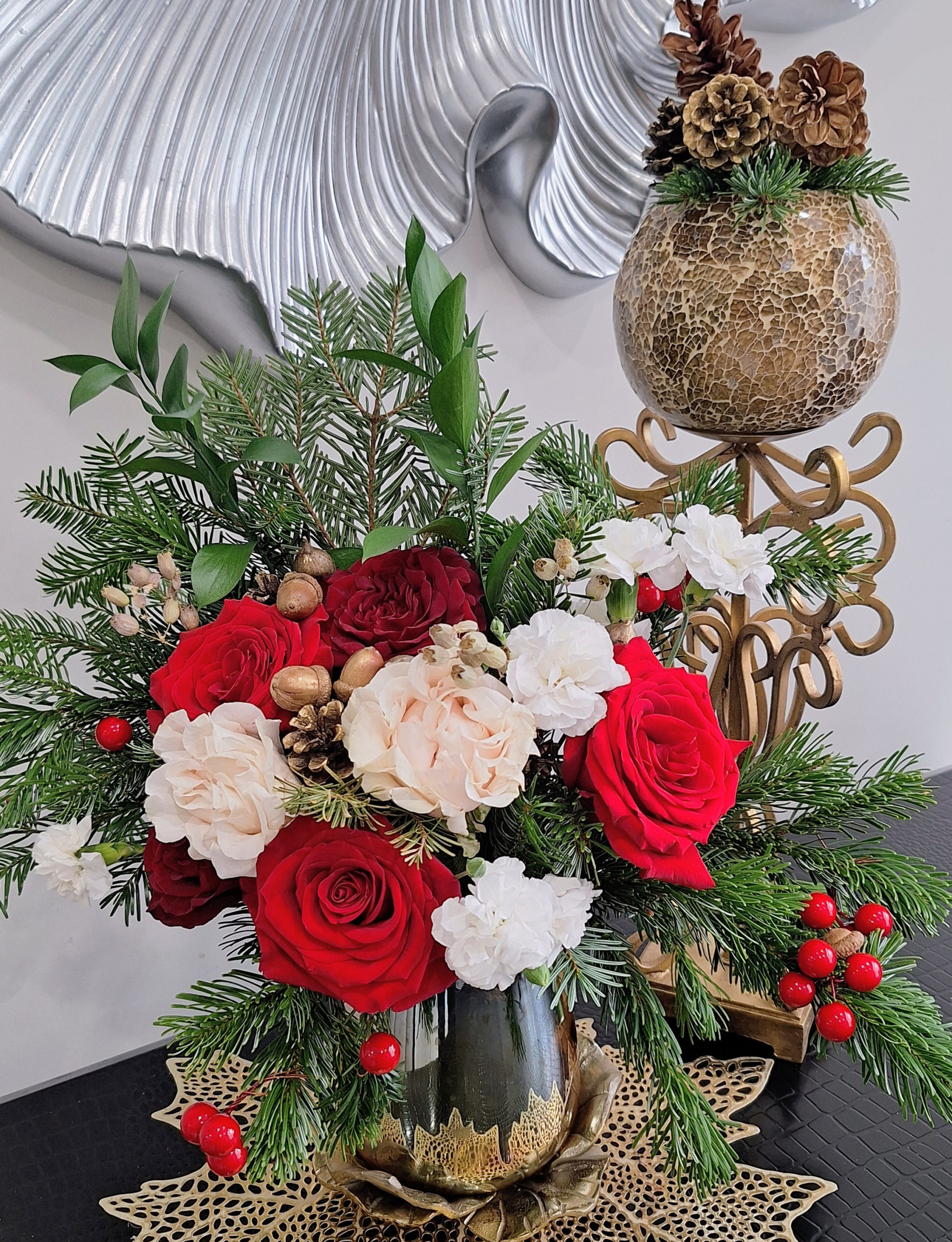 Christmas flower arrangement with red roses, white carnations, evergreen branches, pinecones, and red berries in a decorative vase.