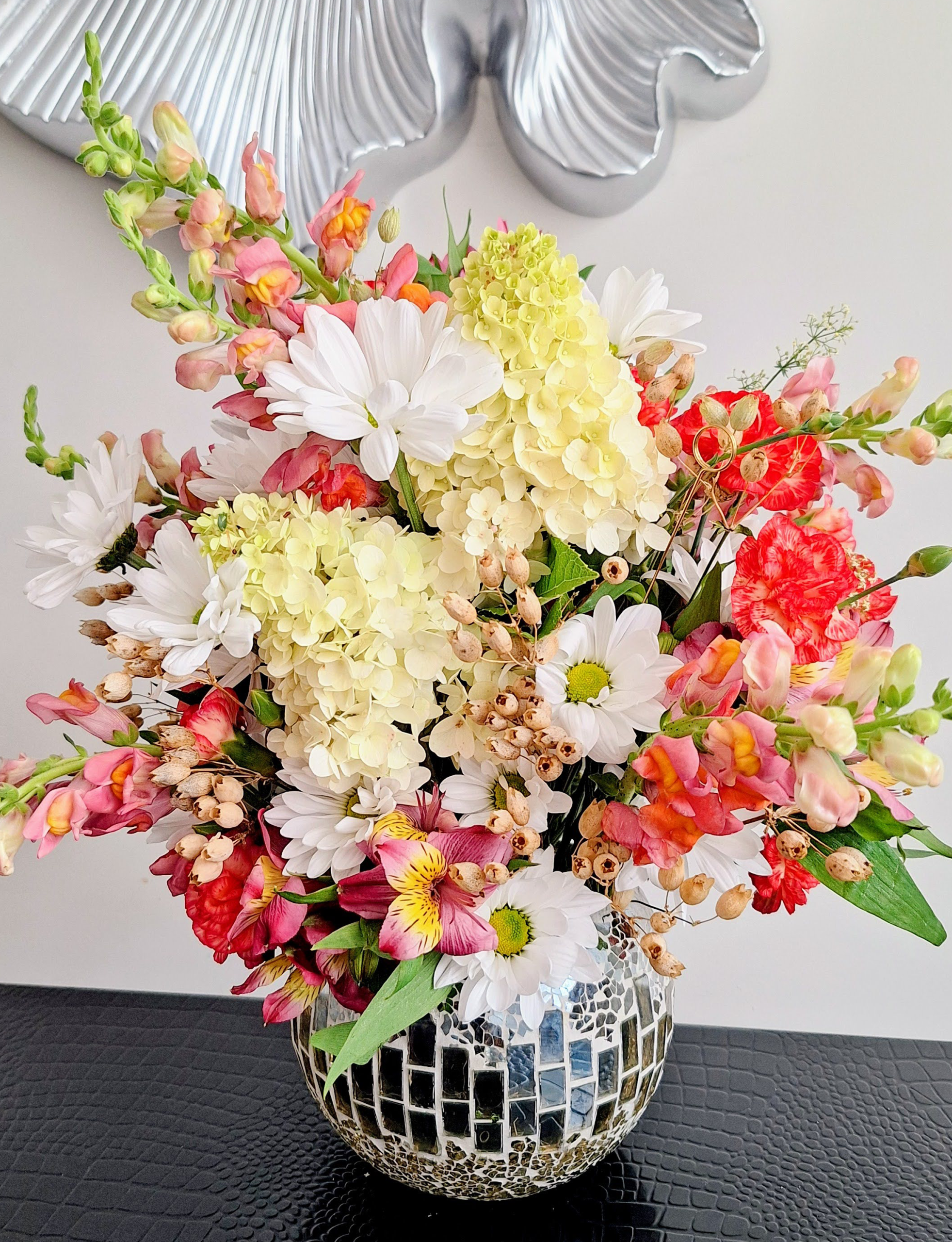 Elegant mixed flower arrangement with hydrangeas, daisies, snapdragons, and seasonal blooms in a decorative mosaic vase.