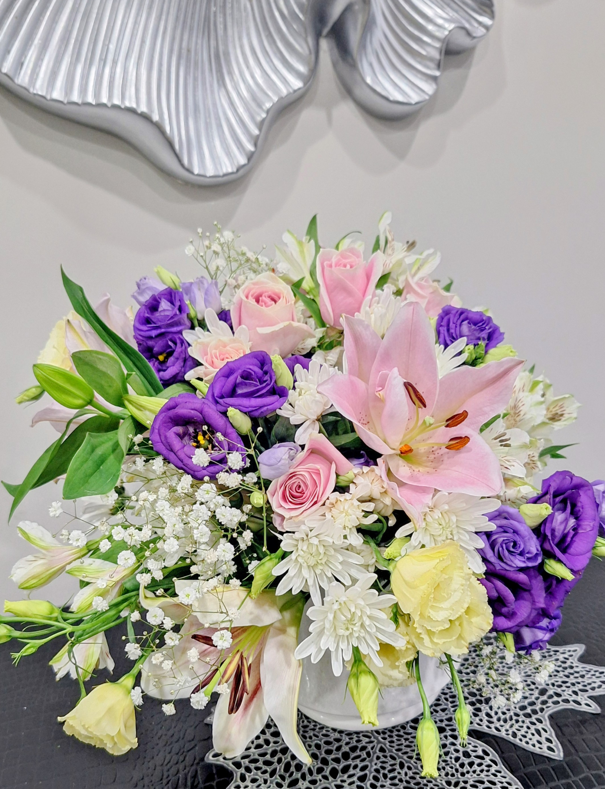 Elegant flower arrangement with pink lilies, roses, purple lisianthus, white chrysanthemums, and baby's breath.