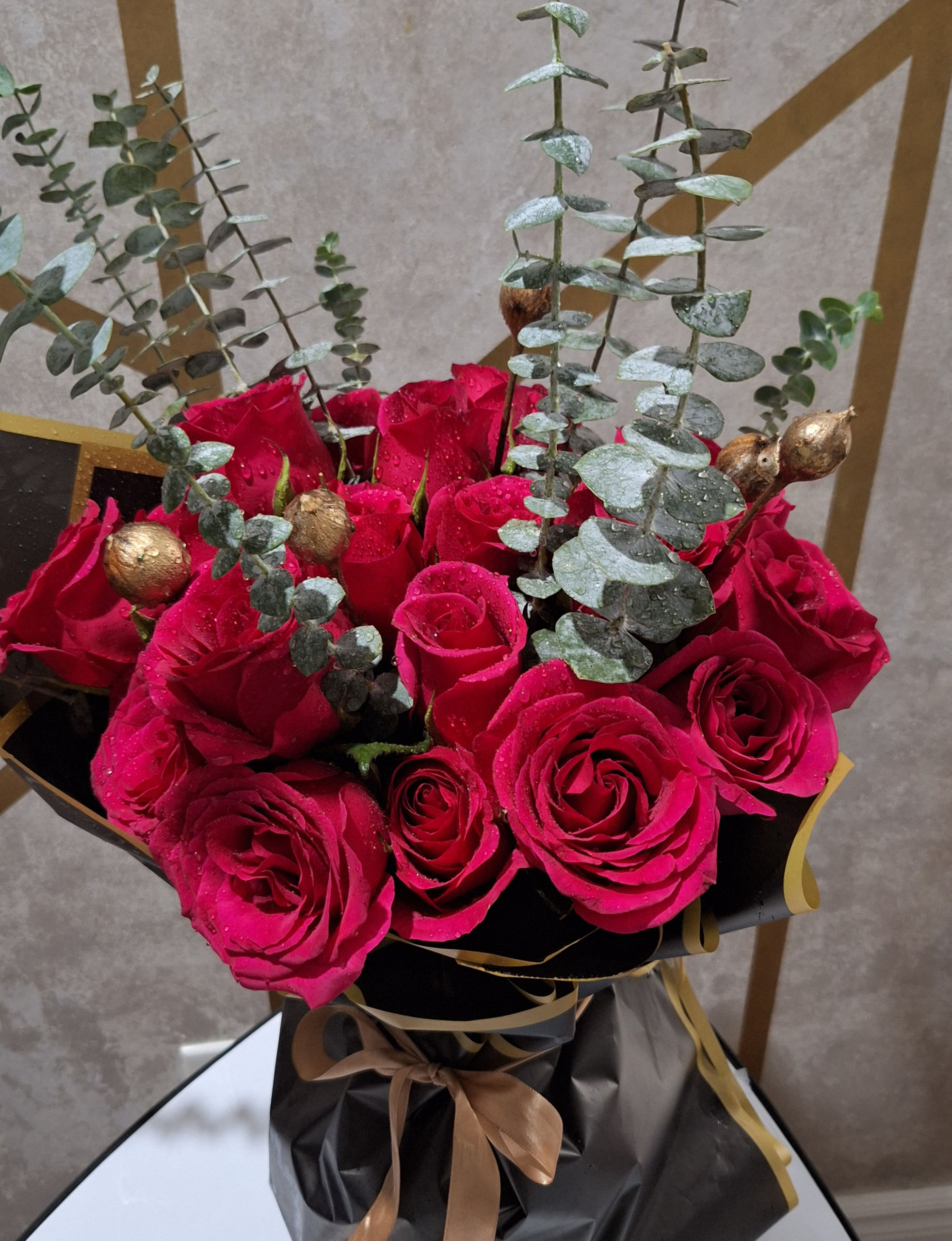 Elegant red rose bouquet with eucalyptus greenery wrapped in black and gold floral paper.