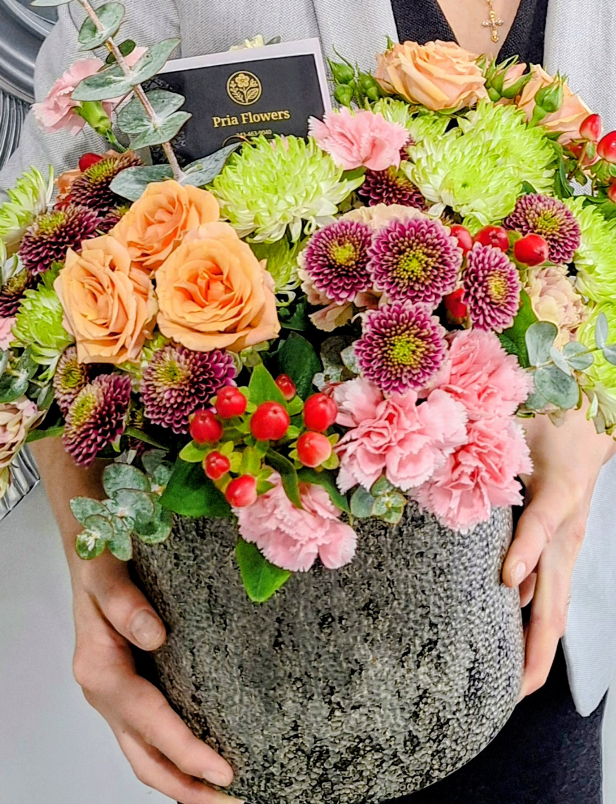 A person holding a modern flower arrangement with peach roses, pink carnations, chrysanthemums, red berries, and eucalyptus in a textured gray pot.